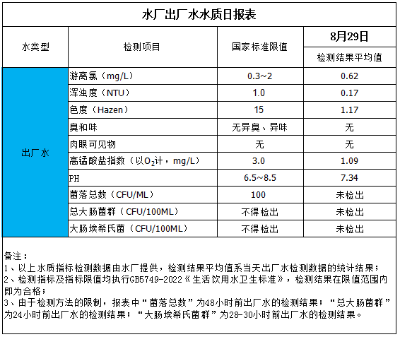 水廠出廠水水質(zhì)日報表(2025-8-29)