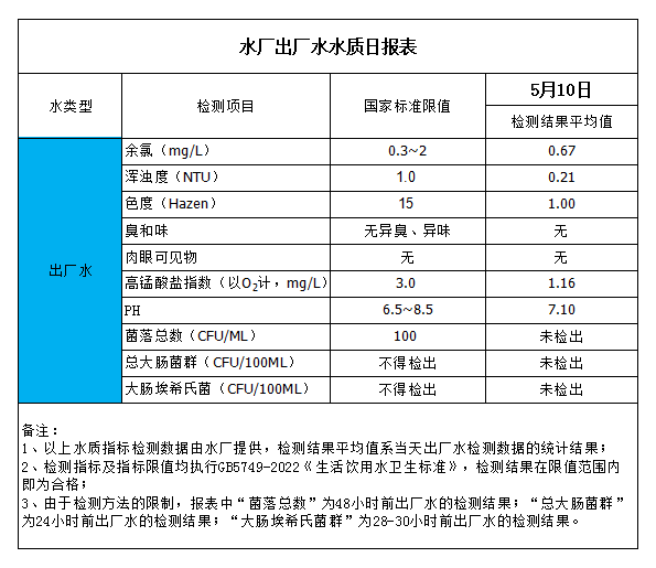 水廠出廠水水質日報表(2023-5-10)
